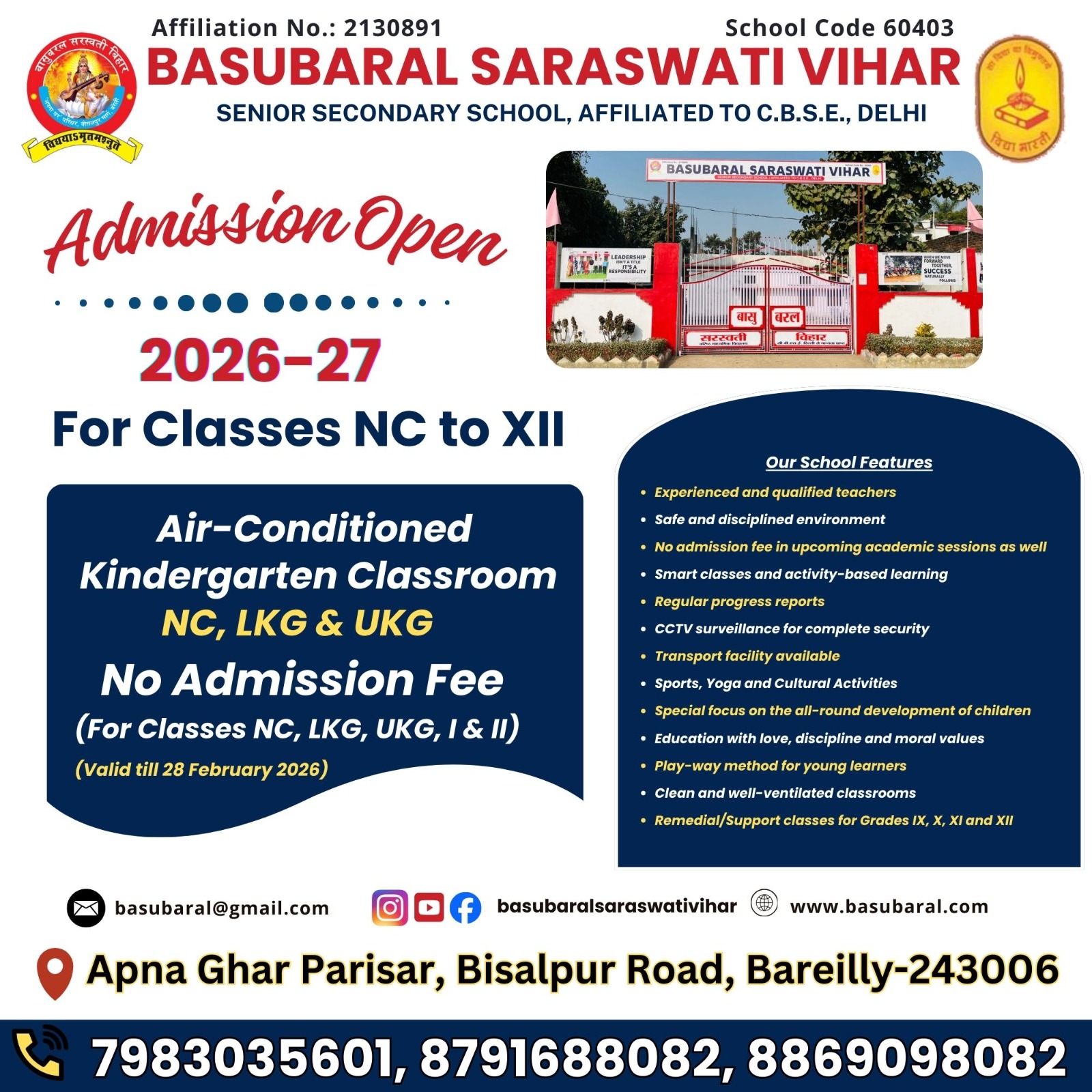 The name of the school, Basubaral, draws inspiration from the ancient founders of Bareilly. Historical accounts mention a king named Jagat Singh, who had two sons - Basudev and Baraldev. They founded the city Bans Bareilly, which over time evolved into the name Bareilly. Our institution proudly carries forward this legacy through its name and values.